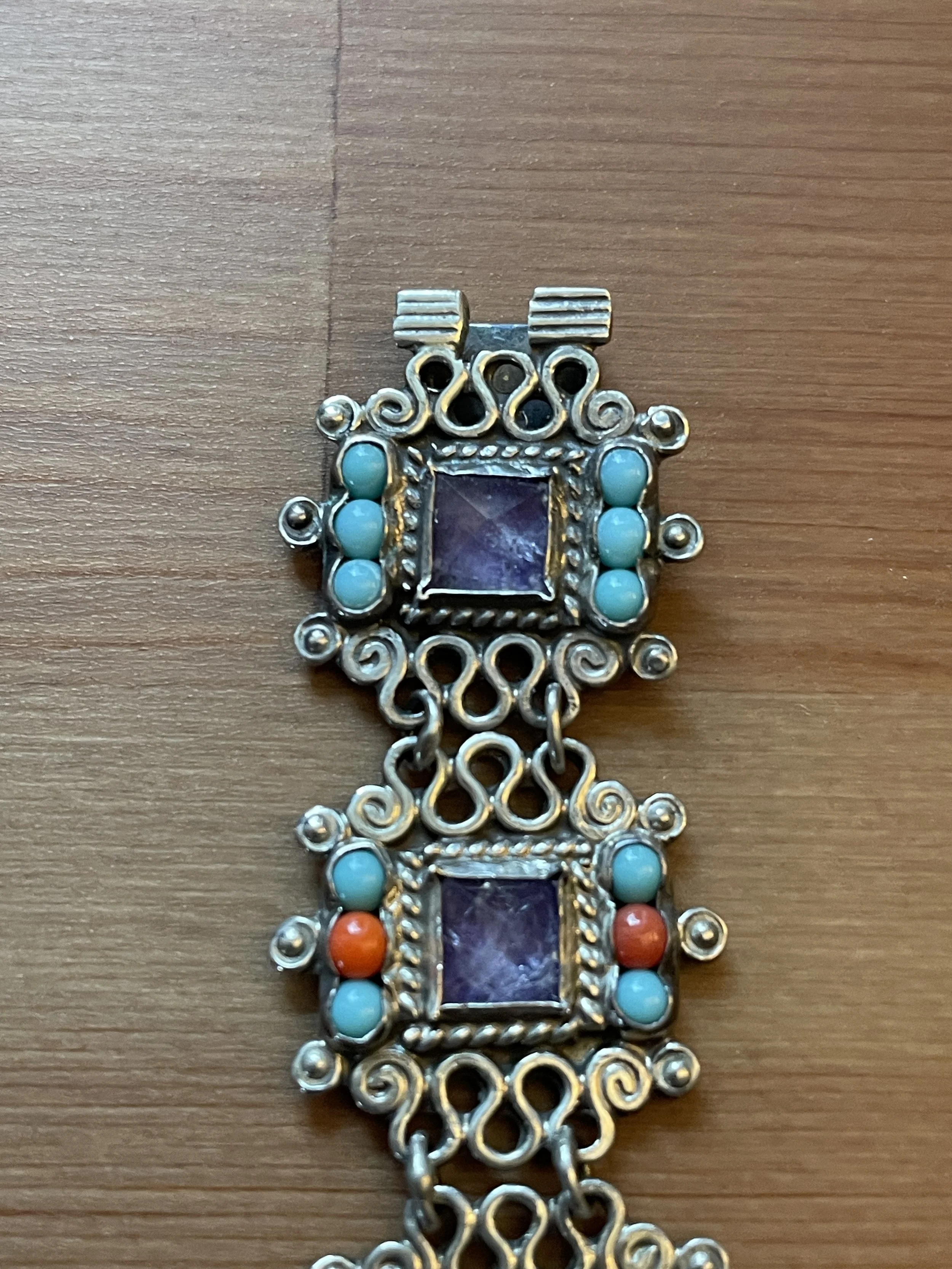 Materials: Sterling silver (925). Inlaid with natural turquoise, sodalite, and jasper (stone identification based on visual characteristics typical of Taxco silverwork).